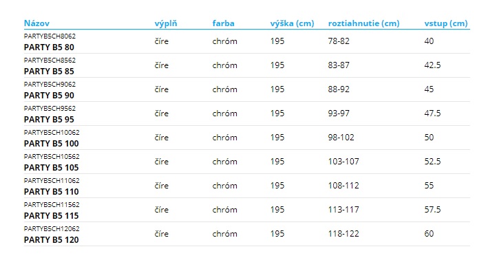 Sprchové dvere PARTY B5 s jednými otváracími dverami na pánty. Bezpečnostné sklo s antiplakovou povrchovou úpravou proti usádzaniu vodného kameňa - TEKNO.CAL. Samozrejmosťou je vyšší štandard hrúbky bezpečnostného skla – až 8 mm a celková výška 195 cm. Magnetické uzatváranie dverí, chrómová podlahová lišta, vyrovnávací profil s 2 cm roztiahnutím a farba kovových častí v chróme. Čisté plochy kaleného skla v kombinácií s chrómovými časťami pántov a doplnkov, sú tie najlepšie vlastnosti prevedenia kvalitného sprchovacieho kútu.